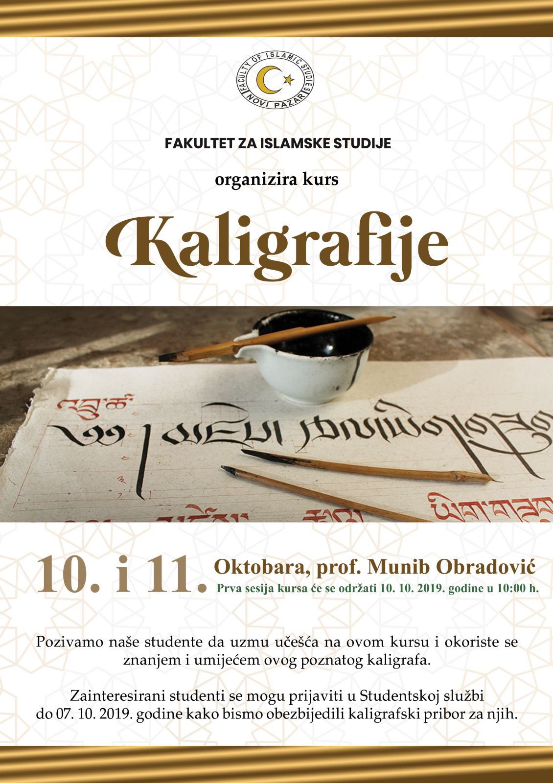 HomeUstanove i službeFakultet za islamske studijeFakultet za islamske studije organizira kurs kaligrafije za studente 6. Oktobra 2019. Fakultet za islamske studije, Ustanove i službe 1447 Fakultet za islamske studije organizira kurs kaligrafije 10 i 11. oktobra prof. Munib Obradović. Prva sesija kursa će se održati 10.10.2019. godine u 10:00 h. Fakultet za islamske studije poziva sve studente da uzmu učešće na kursu i okoriste se znanjem i umijećem ovog poznatog kaligrafa. Zainteresirani studenti se mogu prijaviti u Studentskoj službi, do 07.10.2019. godine kako bismo obezbijedili kaligrafski pribor za njih.