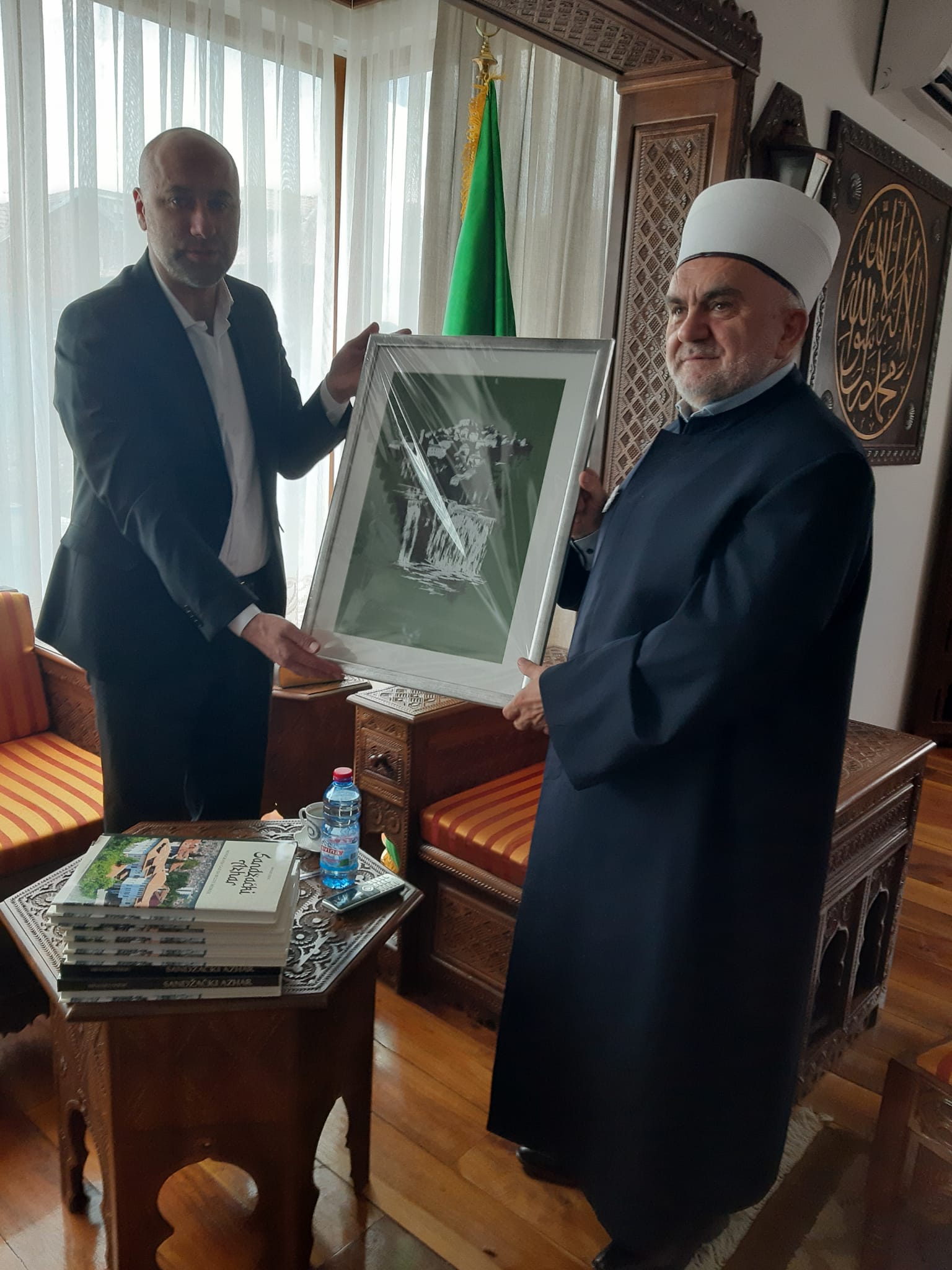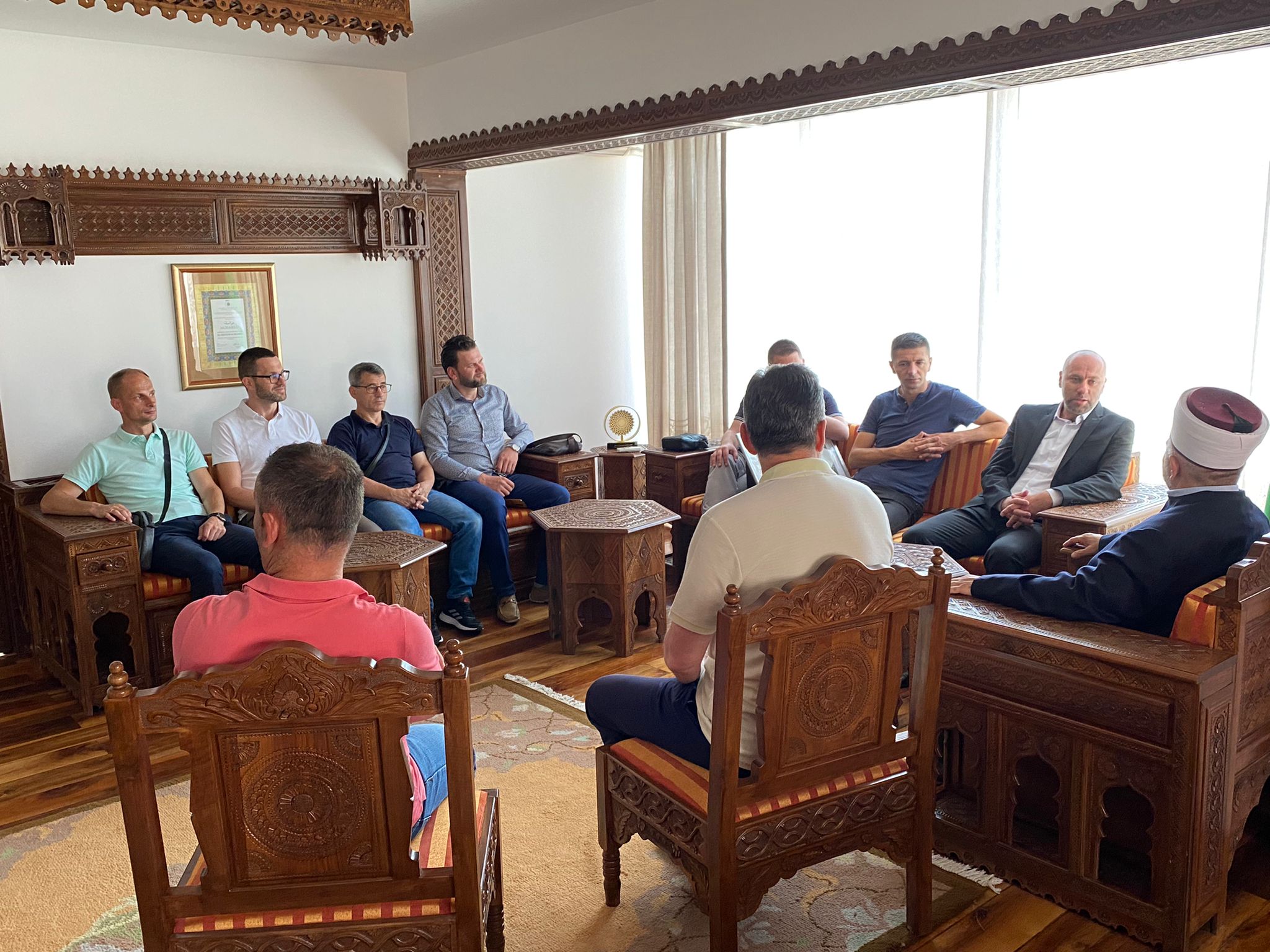 HomeAktuelnostiMuftija Dudić primio imame Medžlisa Jajce 17. Jula 2022. Aktuelnosti, Informativna služba 746 U nedjelju 17.07.2022. godine, predsjednik Mešihata Islamske zajednice muftija dr. Mevlud ef. Dudić primio je grupu imama iz Medžlisa IZ-e Jajce na čelu sa glavnim imamom Zehrudin ef. Hadžićem. Tom prilikom, Zehrudin-efendija upoznao je muftiju Dudića sa infrastrukturim Medžlisa Jajce, koji se prostire na dva bosansko-hercegovačka entiteta sa 21 džamijom, koje su za vrijeme agresije bile porušene, ali su uz velike napore džematlija i dijaspore obnovljene i unaprijeđene. Predsjednik Mešihata je goste upoznao sa hronologijom osnivanja ustanova Mešihata, kao i projektima koji su aktuelni, te dao svesrdnu podršku imamima Medžlisa Jajce u njihovima naporima na području na kojem djeluju.