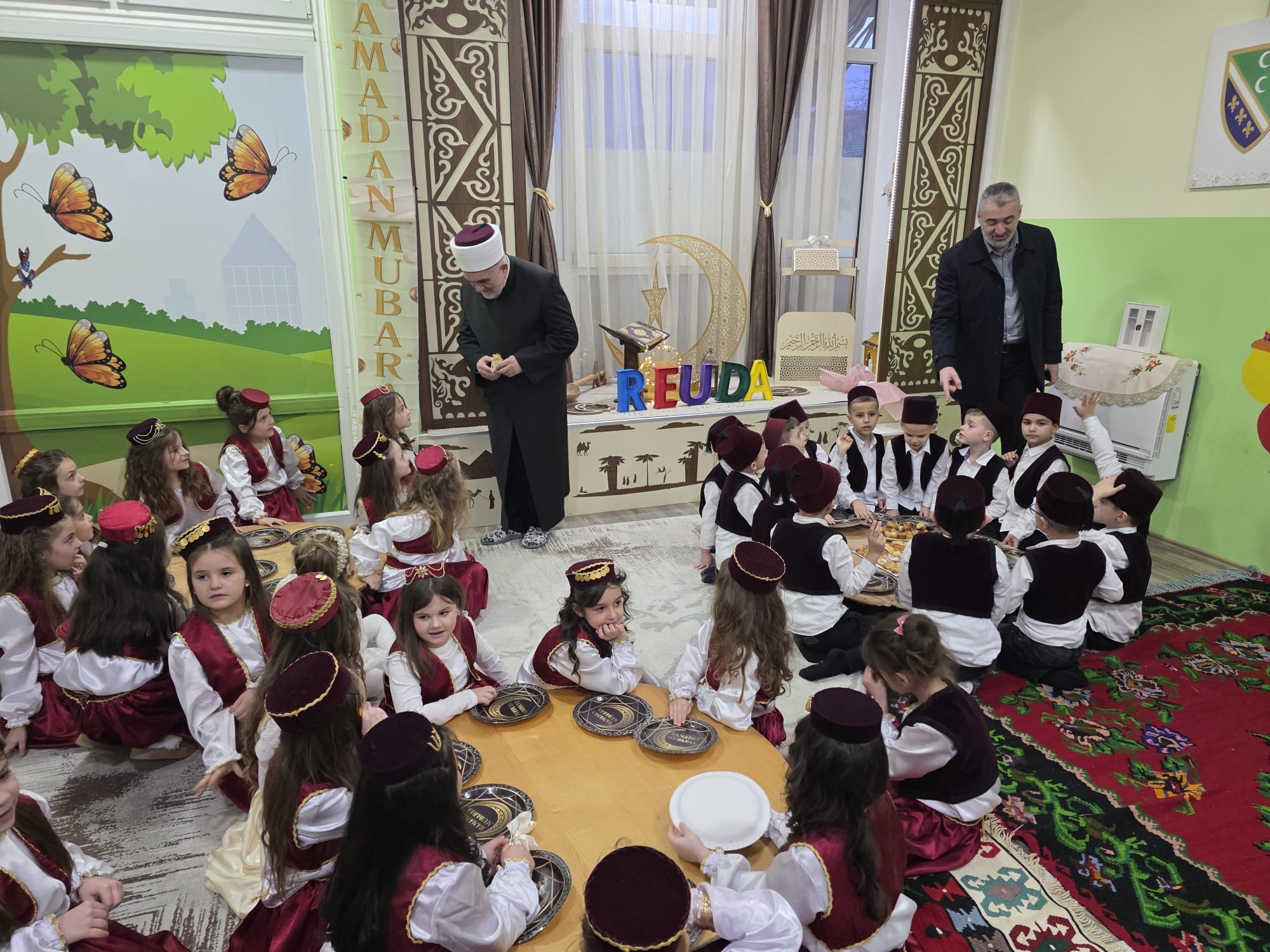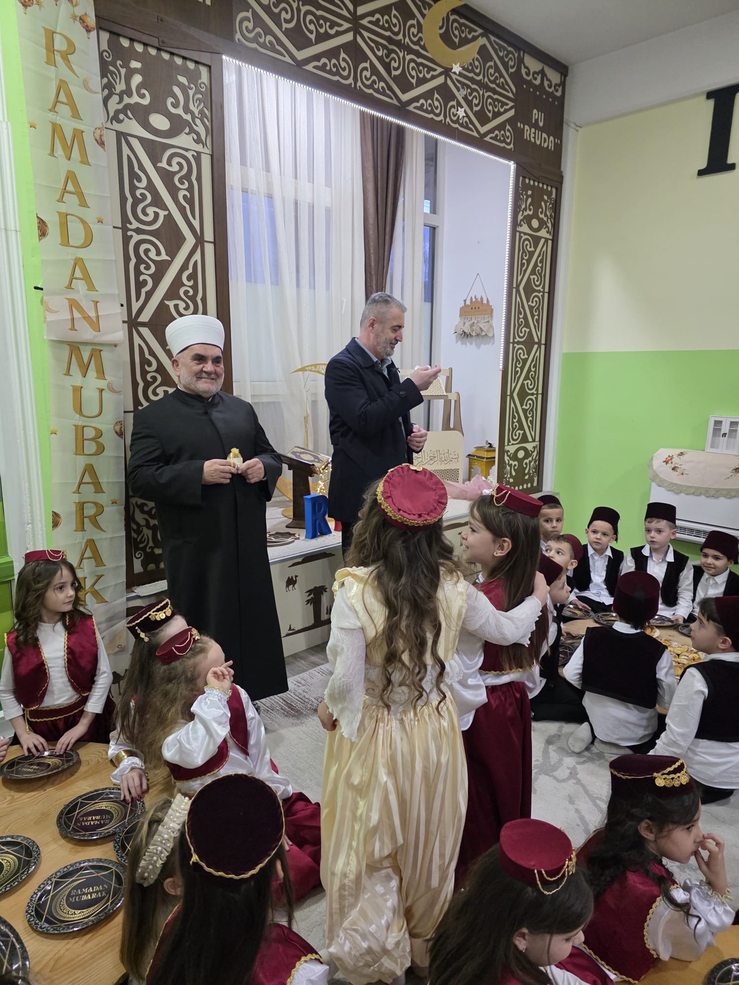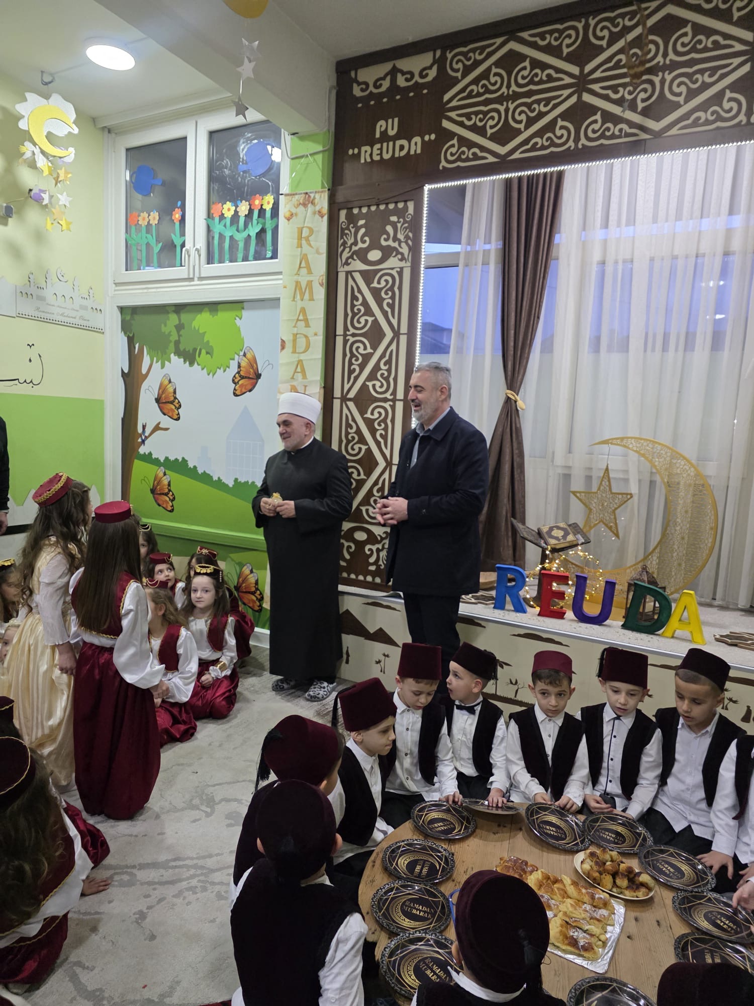 HomeAktuelnostiMuftija Dudić na obilježavanju godišnjice Reude 24. Februara 2026. Aktuelnosti, Mešihat, Predsjednik Mešihata, Muftija sandžački, Informativna služba 602 Dana 24.02.2026. godine, u odjeljenju Predškolske ustanove Reuda na Musali obilježena je 28. godišnjica osnivanja ove odgojno-obrazovne ustanove Mešihata Islamske zajednice. Iftaru je prisustvovala delegacija predvođena predsjednikom Mešihata, muftijom sandžačkim dr. Mevlud ef. Dudićem, koju su činili njegov zamjenik dr. Rešad ef. Plojović i Zuhdija ef. Zukorlić. Prije iftara polaznici su u dvorištu, uz dobrodošlicu muftiji Dudiću, dočekali delegaciju, a zatim je u prelijepom ambijentu priređen iftar zajedno sa djecom iz vrtića, kojeg su upriličili roditelji polaznika. Tom prilikom, predsjednik Mešihata govorio je o svrsi osnivanja Reude, prisjećajući se rahmetli muftije Muamer ef. Zukorlića i njegove vizije. Istakao je da je za nas ovaj projekat bio i ostao misija, ne povodeći se finansijskim interesom. Cilj nam je bio nadomjestiti ono što je propušteno u našim porodicama uslijed zauzetosti roditelja i ubrzanog tempa života. Istakao je da su dječica naš ponos, gdje njihove odgajateljice ulažu ogroman napor i zaslužuju svaku pohvalu. Naglasio je da su one zamjena majkama naših polaznika i čestitao upravnici msc. Elviri Mekić, svim njenim saradnicama i osoblju Reude. Kazao je da je ovaj iftar za njega posebna počast jer je uživao sa polaznicima vrtića i cijelom ekipom koja je napravila nesvakidašnji ugođaj na Musali. U ime kolektiva, muftiji Dudiću uručen je poklon za podršku koju Mešihat u kontinuitetu pruža Predškolskoj ustanovi Reuda. Upravnica vrtića zahvalila se na posjeti i izrazila posebnu radost da se delegacija odazvala njihovom pozivu na iftar.