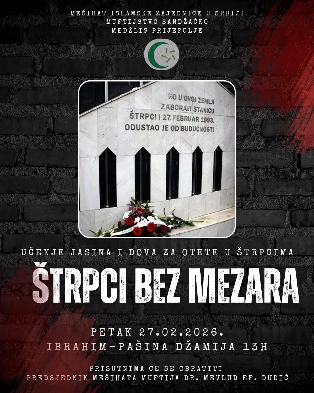 HomeAktuelnosti33 godine od otmice u Štrpcima 25. Februara 2026. Aktuelnosti, Mešihat, Informativna služba 326 U petak 27. februara 2026. god. navršit će se pune 33 godine od stravičnog zločina u Štrpcima, kada su na ovaj dan 1993. god. iz voza na relaciji Beograd–Bar nasilno izvedeni i oteti nevini civili, od kojih 18 Bošnjaka, jedan Hrvat i jedan neidentificirani putnik, koji su potom ubijeni. Ovaj zločin ostaje trajna rana u kolektivnom pamćenju našeg naroda i opomena čitavom čovječanstvu. Njihova žrtva nas obavezuje na trajno sjećanje, dostojanstveno obilježavanje i neprestanu borbu i podršku porodicama za istinu i pravdu. Tim povodom, Mešihat Islamske zajednice u Srbiji i Medžlis IZ-e Prijepolje će u petak, 27. februara 2026. godine, u Ibrahim-pašinoj džamiji u Šarampovu upriličiti učenje dove i sure Jasin za šehide Štrbaca, sa početkom u 13 h. Skupu će prisustvovati delegacija Islamske zajednice, koju će predvoditi predsjednik Mešihata, muftija sandžački dr. Mevlud ef. Dudić. Medžlis Prijepolje upućuje poziv svim džematlijama i sandžačkoj ulemi da svojim prisustvom podrže ovu aktivnost, pokažu jedinstvo i potvrde da kultura sjećanja ostaje naša trajna obaveza.
